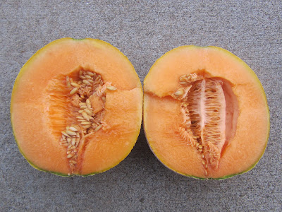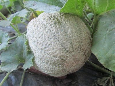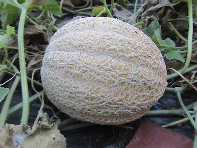 This past weekend saw our first dip to near freezing weather. While it wasn't a killing frost, the lawn was a frosty white Saturday morning and the bird bath was frozen solid. With that in mind, I harvested the last of the "tender" crops earlier in the week. Top on my list was my one and only "Lambkin", a Piel de Sapo melon from Spain. After I finished planting all of my dahlias in early July, I still had a bit of bare garden left. And of coarse I couldn't let that stay that way! So I picked up two "Lambkin" melon plants at the Farmer's Market. I knew it was pretty late in the year and that part of the garden is fairly shady, but nothing ventured, nothing gained. I was rewarded for my optimism with one - yes one! - set melon. It has been growing and slowly maturing. Finally this week the mottled green skin began to turn yellow. It was time for a harvest! It was quite aromatic and had a very interested solid white flesh.